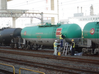 おや、日新の操車さんでもなければ、神奈川臨海の操車さんでもない作業員さんが脚立を抱えて専用線をうろうろしています。そして後ろのタキ1000のENEOSマーク右肩に丸いステッカーが付いているのがわかります。なんでしょう。
